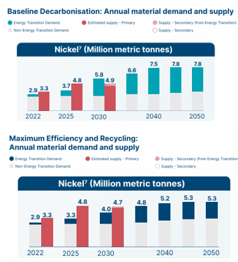 Fig. 5 shows scenarios considered by the Energy Transition Commission (ETC) and their projection of supply, demand, and the possible supply gap. Both studies show a need for the investment of tens of billions of dollars in new primary production of nickel, and also in plants for recycling LIBs to produce secondary Nickel and other metals.